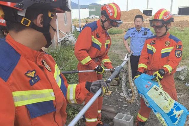 6 月 19 日上午,南安市水头镇一村民家报警称,一条大蟒蛇在自家鸭圈内偷吃鸭子。消防员到达现场后,发现一条约 1.5 米长的蟒蛇蜷缩在鸭圈角落处,不远处一只刚被蛇吞至一半的鸭子被其吐了出来。消防员找准时机利用铺蛇器成功控制住蛇头,后将蟒蛇抬出鸭圈放入编织袋中,带回进行放生处理。